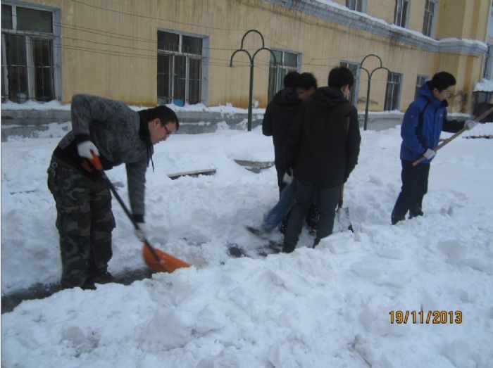 上周哈尔滨迎来了今冬的第一场大雪,持续三天的大雪给哈市带来了独特的风景,但同时也增添了许多麻烦。我校各公寓周围的积雪严重影响了同学们的出行。11月19日雪刚停,来自1202103班的同学们就在班长和团支书的带领下,志愿与三公寓的阿姨们组成“清雪小分队”,为三公寓天井内清出供同学们出行的路。