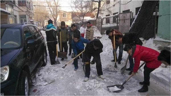 24日早8:30,志愿者们在哈工大二公寓前楼集合,共同前往永乐高青协长期合作社区---花园社区进行志愿清雪活动。早九点,清雪活动正式开始,志愿者和社区阿姨一起进行清雪工作,铲子,锹,镐齐上阵。艰难的扫雪条件并没有影响志愿者们的热情和工作效率,大家团结协作,顶着寒风,将社区内主要路线的积雪清扫干净。志愿者们热火朝天、干劲十足的扫雪身影也感染了其他人,期间社区内居住的其他学生也加入到清雪队伍中来,其中不乏一名刚上初一的小朋友。