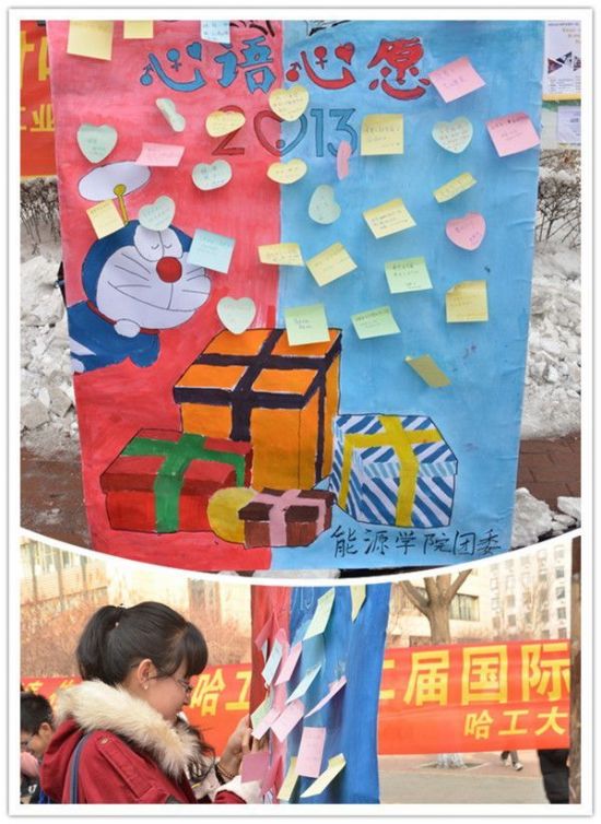 “心语心愿”活动以“请你做我的哆啦A梦”为主题,先后在一校区和二校区展开,吸引了大量同学参与。同学们积极写下自己的小小心愿,并贴在展板上,期待有人为他实现。活动受到了广大同学的欢迎,有许多同学的心愿得到了实现。“写给未来”是专门为大一同学举办的活动,旨在帮助大一同学明确对未来的想法,让他们度过一个有理想的大学生活,同学们在现场对一年后自己想说的话写在纸上放进漂流瓶里,一年后返回。活动当天飘着雪,但是这丝毫没有消退大家的热情。活动吸引了上百名同学的参与,现场气氛热烈。作为本次系列活动的重头戏,以“岁月青葱,舞随心动”为主题的交谊舞会于11月23日晚18点30分在活动中心201拉开帷幕。现场吸引了近二百名同学参与,其中包括了医大、黑大、商大等学校的同学,影响范围非常广。舞会邀请到哈工大芸瑾舞协的老师进行现场教学,还邀请到永乐高拉拉队、轮滑社进行了精彩的表演,更有欢快的游戏和抽奖环节。同学们学习了“慢三”、“快四”、集体舞等舞种,大家积极参与,现场气氛十分热烈,沉醉在舞蹈的海洋。舞会在欢快的氛围中结束,参与的同学纷纷表示意犹未尽,明年的活动一定还会参加。