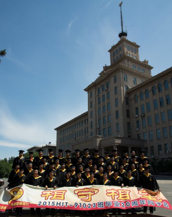 校友共穿本科学士服在主楼前合影