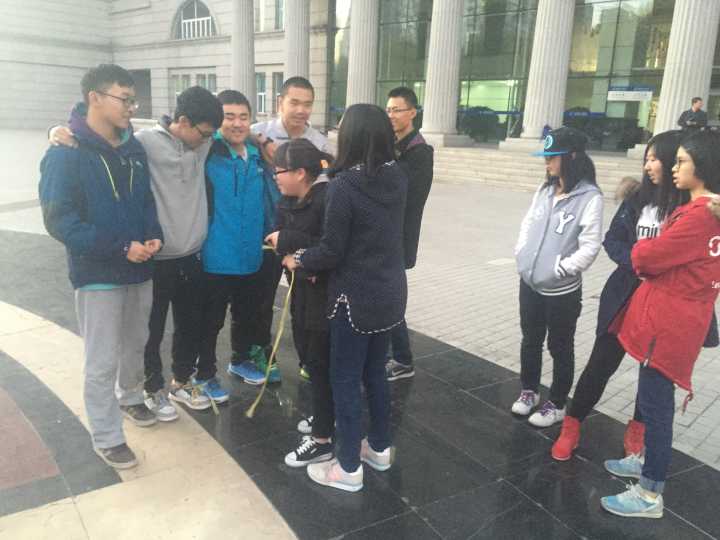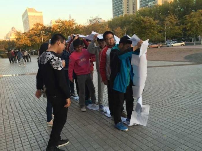 首先,同学们以班级为单位进行内部分组,每班分别形成了1-2支十人左右的队伍,先以队伍为单位进行讨论演戏。起初,由于缺少默契,行进的过程中难免会有磕磕碰碰。经过队内讨论安排后,队伍中的同学对自己的位置有了清楚的认识,在整齐的口号声中,同学之间也开始有了默契的配合。
