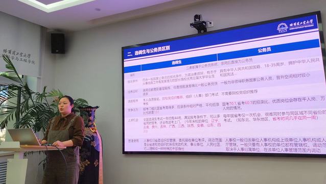 赵书馨对选调生的意义背景、报考条件、考试内容和注意事项进行了详细介绍,梳理了全国各个省份选调生政策和考试时间安排,帮助同学们对选调生的特点及发展路径有了初步了解,提醒大家要科学合理制定报考计划,提前了解报考流程、掌握报考材料,积极参与志愿服务实践,提升自身的综合素质和竞争力。