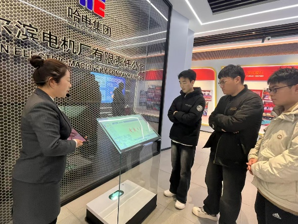 实践团成员在哈尔滨电机厂展厅跟随讲解员的步伐,深入了解了哈尔滨电机厂的历史沿革和在各个历史阶段取得的重大成就,纷纷惊叹于哈电机厂在我国发电设备制造史上做出的重要贡献。在哈尔滨电机厂水力发电设备全国重点实验室,实践团成员知晓了多种水轮机和水泵的实物模型以及大型水力发电设备试验台,近距离感受到了哈尔滨电机厂的硬核技术和大国重器的中国力量。讲解员结合生动案例向同学们介绍了抽水蓄能、三峡水电站、水泵等相关知识,鼓励学生培养创新思维,面向国家重大战略需求而不懈努力。最后,实践团成员与哈尔滨电机厂人力资源部工作人员范紫薇交流,明晰了企业的用人需求及现阶段需要自我提升的方向。